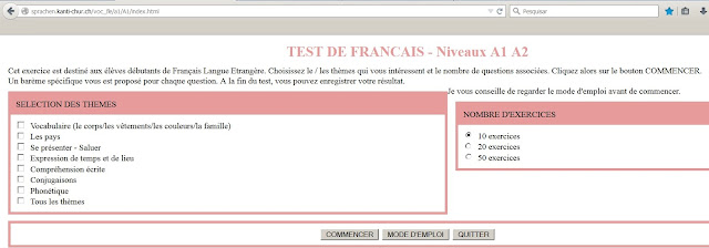 Este é um excelente teste de francês para os níveis A1 - A2. Não deixe de ler o Mode d'emploi antes - escolha a temática dos testes. Registre seu score e arquive. Refaça os testes mais tarde - você poderá perceber sua progressão na lingua francesa. Bom teste !